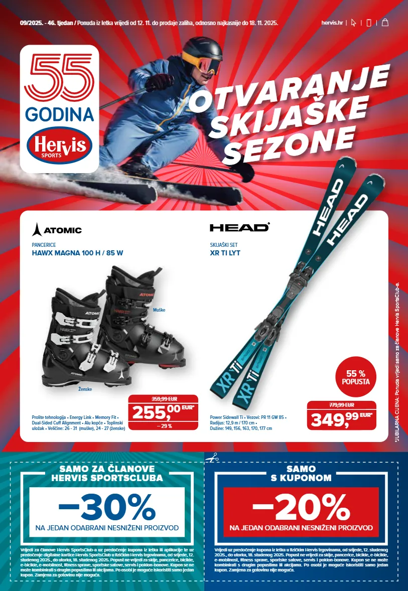 09/2025. - 46. tjedan / Ponuda iz letka vrijedi od 12. 11. do prodaje zaliha, odnosno najkasnije do 18. 11. 2025. hervis.hr *JUBILARNA CIJENA: Ponuda vrijedi samo za članove Hervis SportsClub-a. GODINA OTVARANJE SKIJAŠKE SEZONE SKIJAŠKI SET XR TI LYT Prolite tehnologija • Energy Link • Memory Fit • Dual-Sided Cuff Alignment • Alu kopče • Toplinski uložak • Veličine: 26 - 31 (muške), 24 - 27 (ženske) Power Sidewall Ti • Vezovi: PR 11 GW 85 • Radijus: 12,9 m / 170 cm • Dužine: 149, 156, 163, 170, 177 cm Ženske PANCERICE HAWX MAGNA 100 H / 85 W Muške 255, 00 EUR* 359,99 EUR – 29 % 55 % POPUSTA 349, 99 EUR* 779,99 EUR SAMO S KUPONOM SAMO ZA ČLANOVE HERVIS SPORTSCLUBA –20% NA JEDAN ODABRANI NESNIŽENI PROIZVOD –30% NA JEDAN ODABRANI NESNIŽENI PROIZVOD Vrijedi za članove Hervis SportsClub-a uz predočenje kupona iz letka ili aplikacije te uz predočenje digitalne kartice Hervis SportsClub u fizičkim Hervis trgovinama, od srijede, 12. studenog 2025., do utorka, 18. studenog 2025. Popust ne vrijedi za skije, pancerice, bicikle, e-bicikle, e-mobilnost, fitness sprave, sportske satove, servis i poklon-bonove. Kupon se ne može kombinirati s drugim popustima ili akcijama. Po osobi je moguće iskoristiti samo jedan kupon. Zamjena za gotovinu nije moguća. Vrijedi uz predočenje kupona iz letka u fizičkim Hervis trgovinama, od srijede, 12. studenog 2025., do utorka, 18. studenog 2025. Popust ne vrijedi za skije, pancerice, bicikle, e-bicikle, e-mobilnost, fitness sprave, sportske satove, servis i poklon-bonove. Kupon se ne može kombinirati s drugim popustima ili akcijama. Po osobi je moguće iskoristiti samo jedan kupon. Zamjena za gotovinu nije moguća.