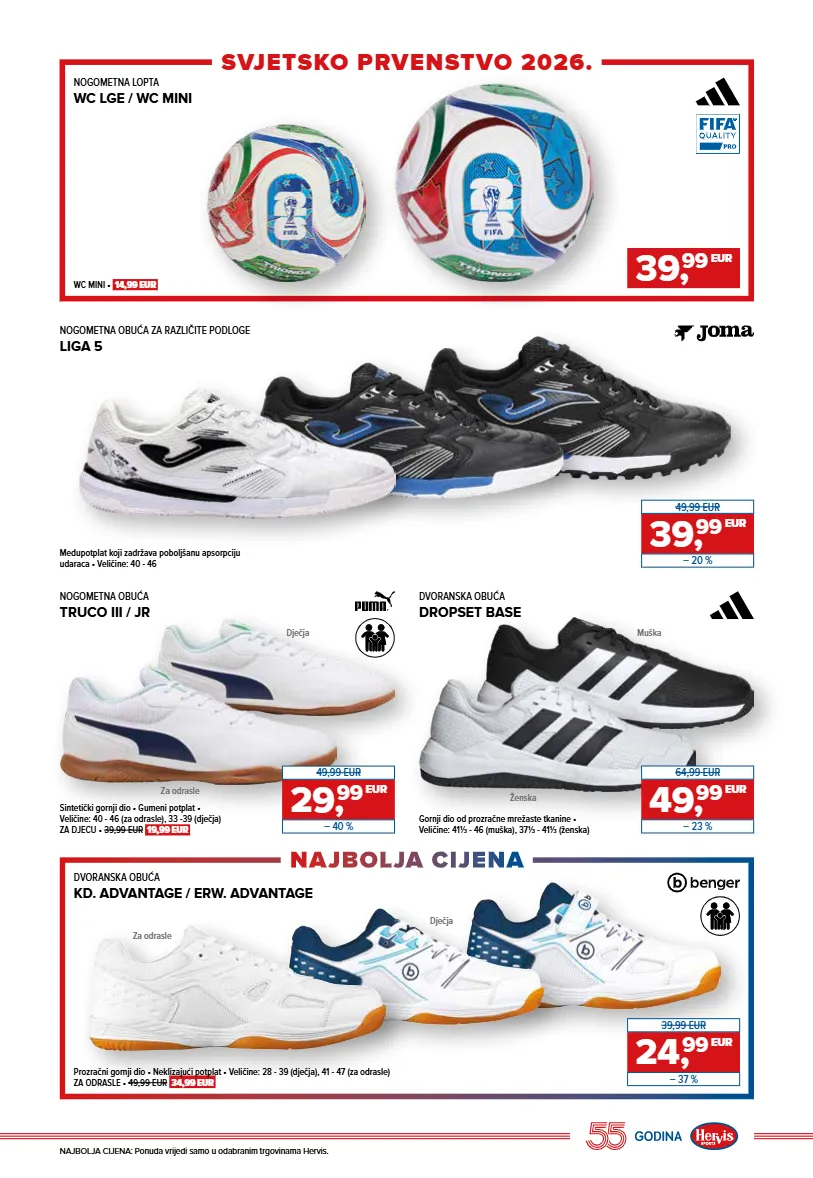najbolja cijena: ponuda vrijedi samo u odabranim trgovinama hervis. svjetsko prvenstvo 2026. najbolja cijena dvoranska obuća kd. advantage / erw. advantage prozračni gornji dio • neklizajući potplat • veličine: 28 - 39 (dječja), 41 - 47 (za odrasle) za odrasle • 49,99 eur 34,99 eur 24, 99 eur 39,99 eur – 37 % nogometna obuća za različite podloge liga 5 međupotplat koji zadržava poboljšanu apsorpciju udaraca • veličine: 40 - 46 39, 99 eur 49,99 eur – 20 % nogometna obuća truco iii / jr sintetički gornji dio • gumeni potplat • veličine: 40 - 46 (za odrasle), 33 -39 (dječja) za djecu • 39,99 eur 19,99 eur za odrasle dječja 29, 99 eur 49,99 eur – 40 % nogometna lopta wc lge / wc mini 39, 99 eur wc mini • 14,99 eur dvoranska obuća dropset base 49, 99 eur 64,99 eur – 23 % gornji dio od prozračne mrežaste tkanine • veličine: 41⅓ - 46 (muška), 37⅓ - 41⅓ (ženska) muška ženska dječja za odrasle