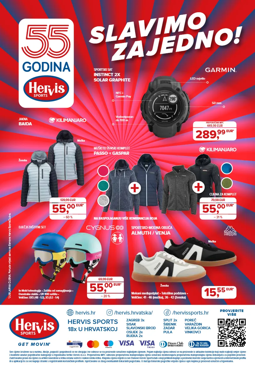 g e t m o v i n’ hervis sports 18x u hrvatskoj hervis.hr /hervissports.hr /hervis.hrvatska/ sve cijene izražene su u eurima. akcije, popusti i pogodnosti se ne zbrajaju i ne odnose se na proizvode označene najboljom cijenom. pojam najbolja cijena odnosi se na proizvode iz aktualne kolekcije koji nude najbolji omjer cijene i kvalitete unutar pojedinačne kategorije u trgovinama tvrtke hervis d.o.o. preporučena mpc odnosno preporučena maloprodajna cijena označava neobvezujuću preporučenu maloprodajnu cijenu dobavljača za pojedini proizvod. zadržavamo pravo da cijene za artikle navedene u letku ostanu važeće i nakon isteka letka. klupska cijena vrijedi za sve članove hervis sportsclub-a koji prilikom kupnje u poslovnici koriste svoju karticu vjernosti u internetskom profilu ili u aplikaciji te za sve kupnje stranki s registriranim korisničkim profilom. ispričavamo se zbog eventualnih tiskarskih pogrešaka. u slučaju tiskarske pogreške vrijede cijena i opis kojima je proizvod označen u trgovinama. zagreb 3x sisak slavonski brod osijek 2x rijeka 2x split 2x šibenik zadar pula poreč varaždin velika gorica vinkovci provjerite više 15, 55 eur* jakna baida godina sportski sat instinct 2x solar graphite muška ženska *jubilarna cijena: ponuda vrijedi samo za članove hervis sportsclub-a. 289, 99 eur* preporučena mpc 449,99 eur dječji zaštitni set in-mold tehnologija • zaštita od zamagljivanja • dvostruka stakla • uv 400 zaštita • veličine: xxs (48 - 52), xs (52 - 54) slavimo zajedno! 55, 00 eur* 69,99 eur – 20 % 55, 00 eur* 139,99 eur – 60 % nfc i garmin pay led svjetlo 50 mm vodootporan do 100 m sportsko-modna obuća almuth / venja mekani međupotplat • tekstilna podstava • veličine: 41 - 46 (muška), 36 - 42 (ženska) muška ženska muški ili ženski komplet passo + gaspar na raspolaganju više kombinacija boja 55, 00 eur* 79,98 eur – 31 % cijena za komplet