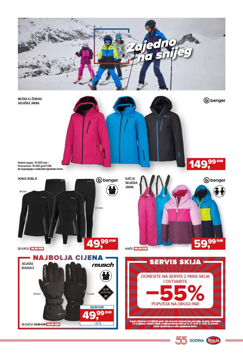 zajedno na snijeg servis skija najbolja cijena 59, 99 eur dječja skijaška jakna donesite na servis 2 para skija i ostvarite –55% popusta na drugi par popust vrijedi na a i b skijaški servis. ako na servis donesete dva para skija, na drugi ostvarujete 55 % popusta. ponuda vrijedi za vrijeme važenja letka od 12. 11. do 18. 11. 2025. za članove hervis sportsclub-a u svim trgovinama hervis. 49, 99 eur 69,99 eur – 33 % skijaške rukavice muške ženske za djecu: 59,99 eur 39,99 eur muška ili ženska skijaška jakna 149, 99 eur vodeni stupac: 10.000 mm • prozračnost: 10.000 gr/m²/24h na raspolaganju u odabranim trgovinama hervis. donje rublje za djecu: 39,99 eur 49, 99 eur hlače: 49,99 eur muško žensko