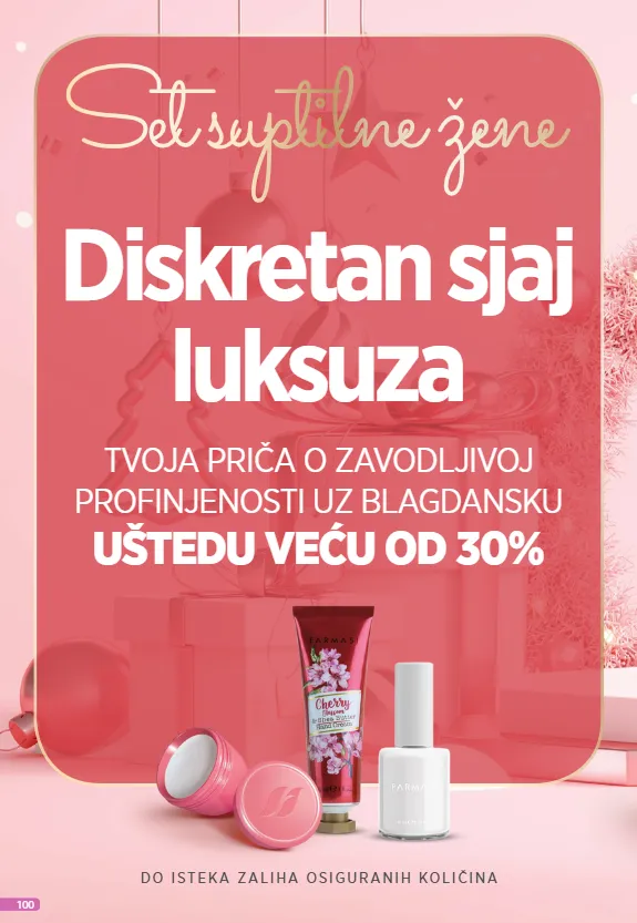 100 D O I S T E K A Z A L I H A O S I G U R A N I H K O L I Č I N A Diskretan sjaj luksuza Set suptilne žene TVOJA PRIČA O ZAVODLJIVOJ PROFINJENOSTI UZ BLAGDANSKU UŠTEDU VEĆU OD 30%