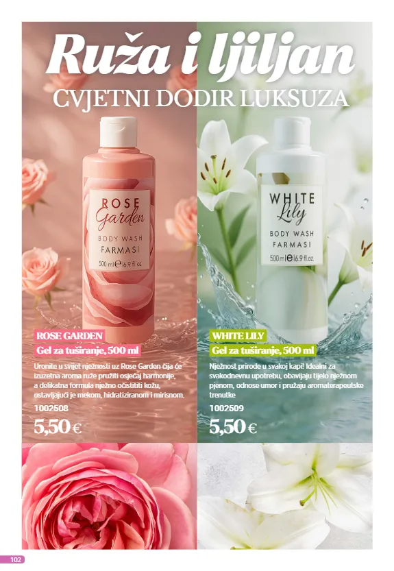 102 ruža i ljiljan rose garden gel za tuširanje, 500 ml uronite u svijet nježnosti uz rose garden čija će izuzetna aroma ruže pružiti osjećaj harmonije, a delikatna formula nježno očistititi kožu, ostavljajući je mekom, hidratiziranom i mirisnom. white lily gel za tuširanje, 500 ml nježnost prirode u svakoj kapi! idealni za svakodnevnu upotrebu, obavijaju tijelo nježnom pjenom, odnose umor i pružaju aromaterapeutske trenutke 1002508 1002509 5,50 € 5,50 € cvjetni dodir luksuza 1002508 1002509