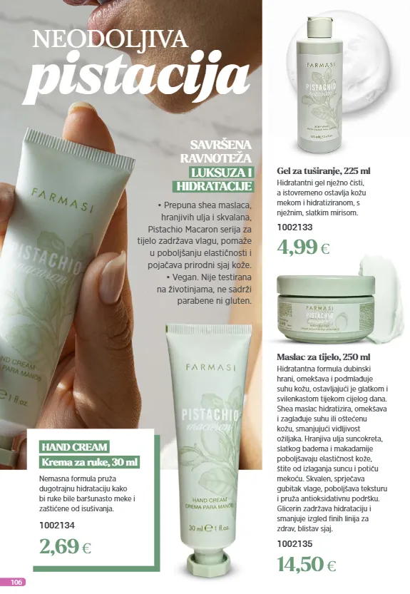 gel za tuširanje, 225 ml hidratantni gel nježno čisti, a istovremeno ostavlja kožu mekom i hidratiziranom, s nježnim, slatkim mirisom. 1002133 1002135 4,99 € 14,50 € maslac za tijelo, 250 ml hidratantna formula dubinski hrani, omekšava i podmlađuje suhu kožu, ostavljajući je glatkom i svilenkastom tijekom cijelog dana. shea maslac hidratizira, omekšava i zaglađuje suhu ili oštećenu kožu, smanjujući vidljivost ožiljaka. hranjiva ulja suncokreta, slatkog badema i makadamije poboljšavaju elastičnost kože, štite od izlaganja suncu i potiču mekoću. skvalen, sprječava gubitak vlage, poboljšava teksturu i pruža antioksidativnu podršku. glicerin zadržava hidrataciju i smanjuje izgled finih linija za zdrav, blistav sjaj. neodoljiva pistacija hand cream krema za ruke, 30 ml nemasna formula pruža dugotrajnu hidrataciju kako bi ruke bile baršunasto meke i zaštićene od isušivanja. 1002134 2,69 € savršena ravnoteža luksuza i hidratacije • prepuna shea maslaca, hranjivih ulja i skvalana, pistachio macaron serija za tijelo zadržava vlagu, pomaže u poboljšanju elastičnosti i pojačava prirodni sjaj kože. • vegan. nije testirana na životinjama, ne sadrži parabene ni gluten. 106 1002133 1002135 1002134
