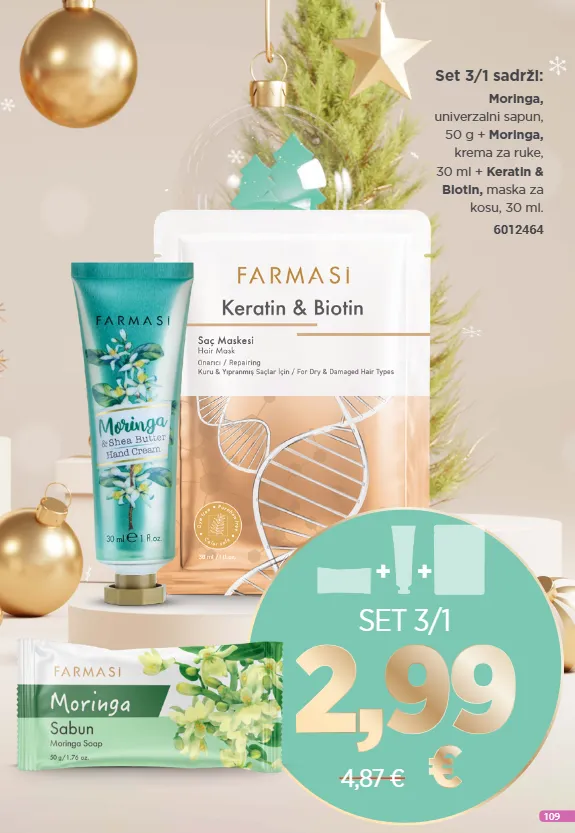 109 6012464 set 3/1 sadrži: moringa, univerzalni sapun, 50 g + moringa, krema za ruke, 30 ml + keratin & biotin, maska za kosu, 30 ml. 2,99 € 4,87 € set 3/1 + + 6012464