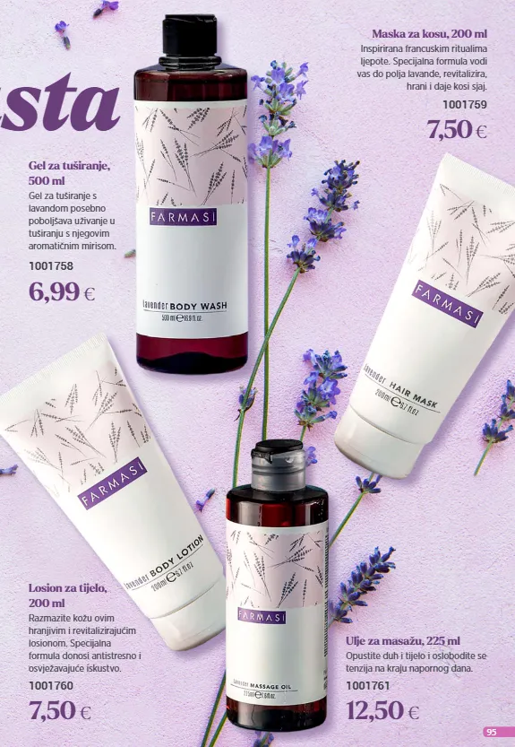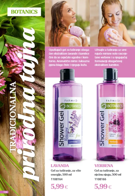 110 1108164 1108165 5,99 € 5,99 € uživajte u tuširanju uz umi- rujuće mirisne note rascvje- tane verbene i u njegujućoj formulaciji obogaćenoj ekstraktom kamilice. lavanda gel za tuširanje, za više energije, 500 ml verbena gel za tuširanje, za nježnu njegu, 500 ml botanics prirodna tajna tradicionalna opuštajući gel za tuširanje oboga- ćen ekstraktom lavande i kamilice čini da se osjećate ugodno i kom- forno. aromatični mirisi i luksuzna pjena blago čiste i njeguju kožu. 1108165 1108164