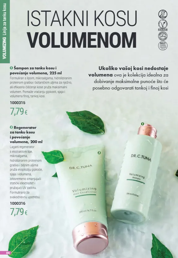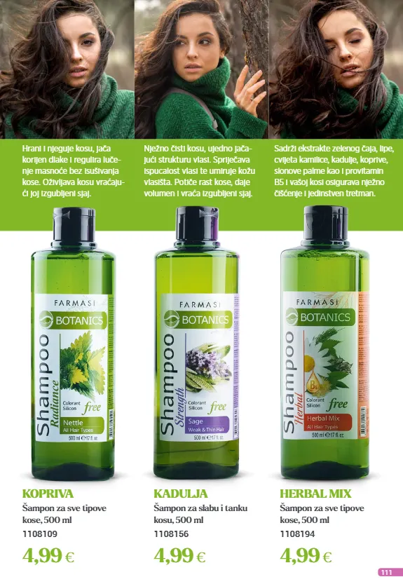 111 KOPRIVA Šampon za sve tipove kose, 500 ml KADULJA Šampon za slabu i tanku kosu, 500 ml HERBAL MIX Šampon za sve tipove kose, 500 ml 1108109 1108156 1108194 4,99 € 4,99 € 4,99 € Hrani i njeguje kosu, jača korijen dlake i regulira luče- nje masnoće bez isušivanja kose. Oživljava kosu vraćaju- ći joj izgubljeni sjaj. Nježno čisti kosu, ujedno jača- jući strukturu vlasi. Spriječava ispucalost vlasi te umiruje kožu vlasišta. Potiče rast kose, daje volumen i vraća izgubljeni sjaj. Sadrži ekstrakte zelenog čaja, lipe, cvijeta kamilice, kadulje, koprive, slonove palme kao i provitamin B5 i vašoj kosi osigurava nježno čišćenje i jedinstven tretman. 1108109 1108156 1108194