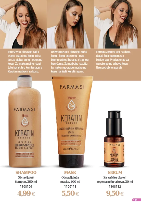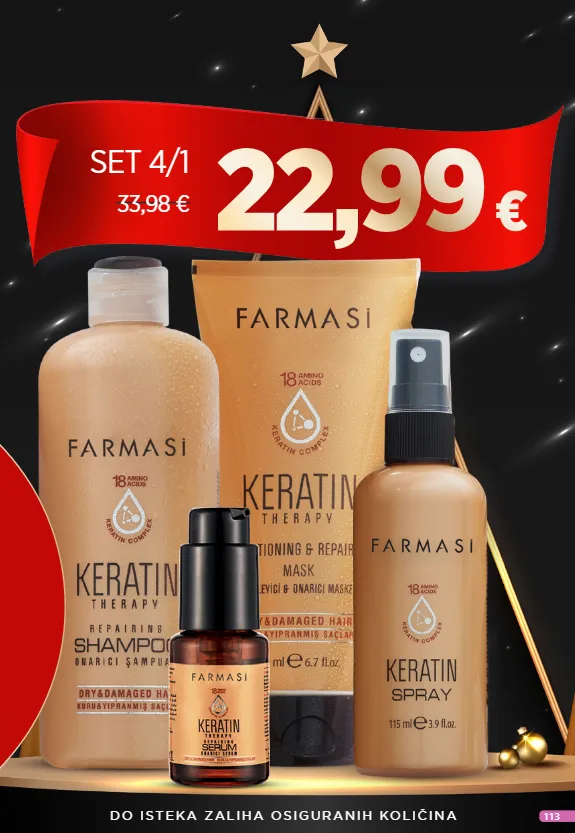 Keratin Set 4/1 sadrži: obnavljajući šampon, 360 ml + obnavljajuća maska, 200 ml + sprej za oporavak kose, 115 ml + serum za zaštitu dlake i regeneraciju vrhova, 30 ml. 6012465 UĐI U NOVU GODINU S KOSOM KAKVU ODUVIJEK ŽELIŠ, A UJEDNO I ŠTEDIŠ VIŠE OD 30% Kosa bez stresa 112 Uz svaki kupljeni Keratin set, FARMASI ukrasna vrećica Redovna cijena GRATIS Dim: 19x26x8 cm 9001608 1,99 € 6012465 9001608