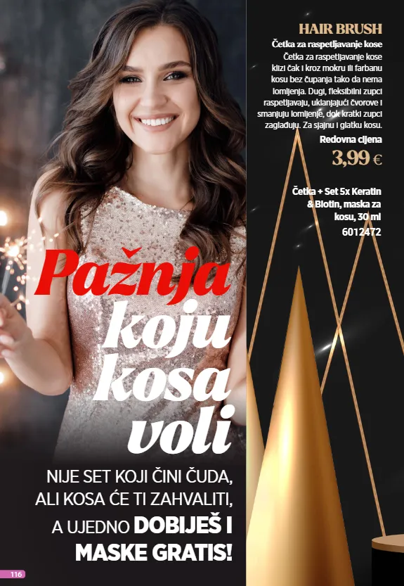 116 Pažnja koju kosa voli NIJE SET KOJI ČINI ČUDA, ALI KOSA ĆE TI ZAHVALITI, A UJEDNO DOBIJEŠ I MASKE GRATIS! 3,99 € HAIR BRUSH Četka za raspetljavanje kose Četka za raspetljavanje kose klizi čak i kroz mokru ili farbanu kosu bez čupanja tako da nema lomljenja. Dugi, fleksibilni zupci raspetljavaju, uklanjajući čvorove i smanjuju lomljenje, dok kratki zupci zaglađuju. Za sjajnu i glatku kosu. 6012472 Četka + Set 5x Keratin & Biotin, maska za kosu, 30 ml Redovna cijena 6012472
