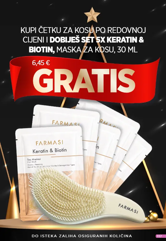 117 D O I S T E K A Z A L I H A O S I G U R A N I H KO L I Č I N A GRATIS KUPI ČETKU ZA KOSU PO REDOVNOJ CIJENI I DOBIJEŠ SET 5X KERATIN & BIOTIN, MASKA ZA KOSU, 30 ML 6,45 €