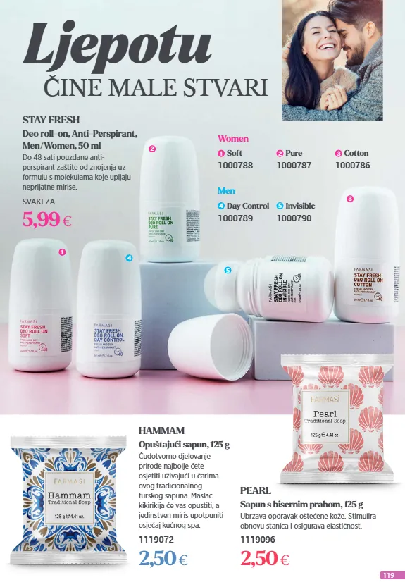 119 1119072 1119096 5,99 € 2,50 € 2,50 € stay fresh deo roll-on, anti-perspirant, men/women, 50 ml do 48 sati pouzdane anti- perspirant zaštite od znojenja uz formulu s molekulama koje upijaju neprijatne mirise. hammam opuštajući sapun, 125 g čudotvorno djelovanje prirode najbolje ćete osjetiti uživajući u čarima ovog tradicionalnog turskog sapuna. maslac kikirikija će vas opustiti, a jedinstven miris upotpuniti osjećaj kućnog spa. pearl sapun s bisernim prahom, 125 g ubrzava oporavak oštećene kože. stimulira obnovu stanica i osigurava elastičnost. 1000787 1000790 1000786 1000788 1000789 svaki za 2 pure 5 invisible 3 cotton 1 soft 4 day control čine male stvari ljepotu women men 1 4 5 2 3 1000787 1000790 1000786 1000788 1000789 1119072 1119096