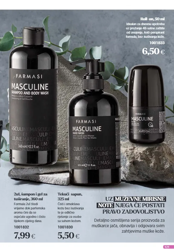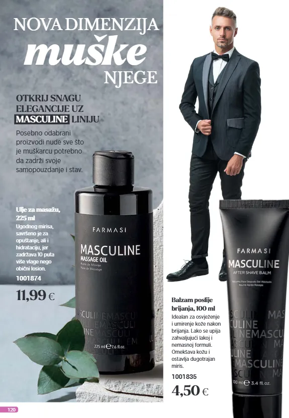 120 nova dimenzija njege muške 1001874 1001835 11,99 € 4,50 € ulje za masažu, 225 ml ugodnog mirisa, savršeno je za opuštanje, ali i hidrataciju, jer zadržava 10 puta više vlage nego obični losion. balzam poslije brijanja, 100 ml idealan za osvježenje i umirenje kože nakon brijanja. lako se upija zahvaljujući lakoj i nemasnoj formuli. omekšava kožu i ostavlja dugotrajan miris. otkrij snagu elegancije uz masculine liniju posebno odabrani proizvodi nude sve što je muškarcu potrebno da zadrži svoje samopouzdanje i stav. 1001874 1001835