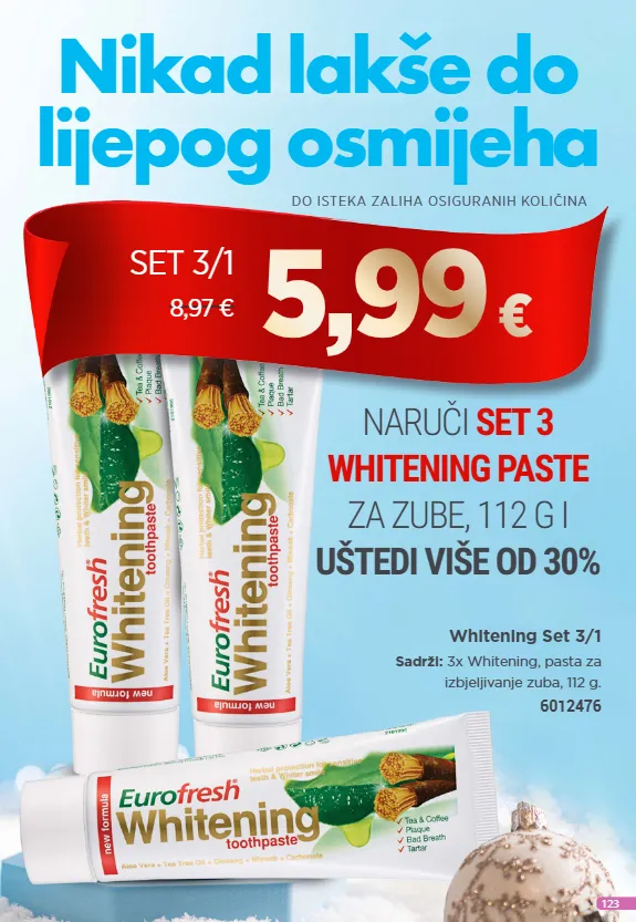 123 6012476 NARUČI SET 3 WHITENING PASTE ZA ZUBE, 112 G I UŠTEDI VIŠE OD 30% SET 3/1 5,99 € 8,97 € Nikad lakše do lijepog osmijeha Whitening Set 3/1 Sadrži: 3x Whitening, pasta za izbjeljivanje zuba, 112 g. DO ISTEKA ZALIHA OSIGURANIH KOLIČINA 6012476