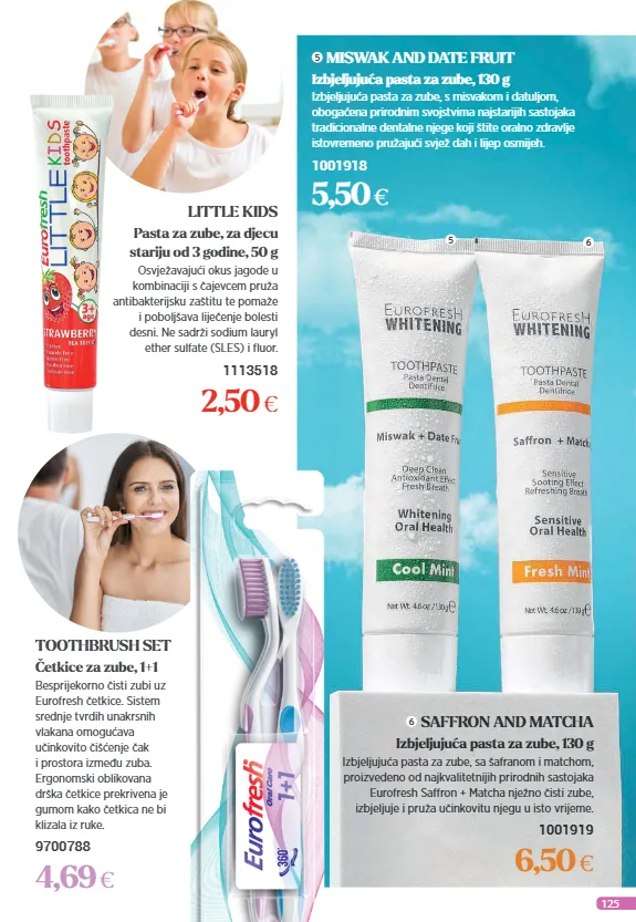 125 1113518 9700788 2,50 € 4,69 € little kids pasta za zube, za djecu stariju od 3 godine, 50 g osvježavajući okus jagode u kombinaciji s čajevcem pruža antibakterijsku zaštitu te pomaže i poboljšava liječenje bolesti desni. ne sadrži sodium lauryl ether sulfate (sles) i fluor. toothbrush set četkice za zube, 1+1 besprijekorno čisti zubi uz eurofresh četkice. sistem srednje tvrdih unakrsnih vlakana omogućava učinkovito čišćenje čak i prostora između zuba. ergonomski oblikovana drška četkice prekrivena je gumom kako četkica ne bi klizala iz ruke. 1001918 5,50 € 5 miswak and date fruit izbjeljujuća pasta za zube, 130 g izbjeljujuća pasta za zube, s misvakom i datuljom, obogaćena prirodnim svojstvima najstarijih sastojaka tradicionalne dentalne njege koji štite oralno zdravlje istovremeno pružajući svjež dah i lijep osmijeh. 1001919 6,50 € 6 saffron and matcha izbjeljujuća pasta za zube, 130 g izbjeljujuća pasta za zube, sa šafranom i matchom, proizvedeno od najkvalitetnijih prirodnih sastojaka eurofresh saffron + matcha nježno čisti zube, izbjeljuje i pruža učinkovitu njegu u isto vrijeme. 5 6 1113518 9700788 1001918 1001919