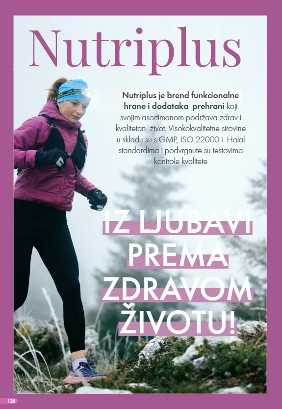 IZ LJUBAVI PREMA ZDRAVOM ŽIVOTU! Nutriplus je brend funkcionalne hrane i dodataka prehrani koji svojim asortimanom podržava zdrav i kvalitetan život. Visokokvalitetne sirovine u skladu su s GMP, ISO 22000 i Halal standardima i podvrgnute su testovima kontrole kvalitete 126