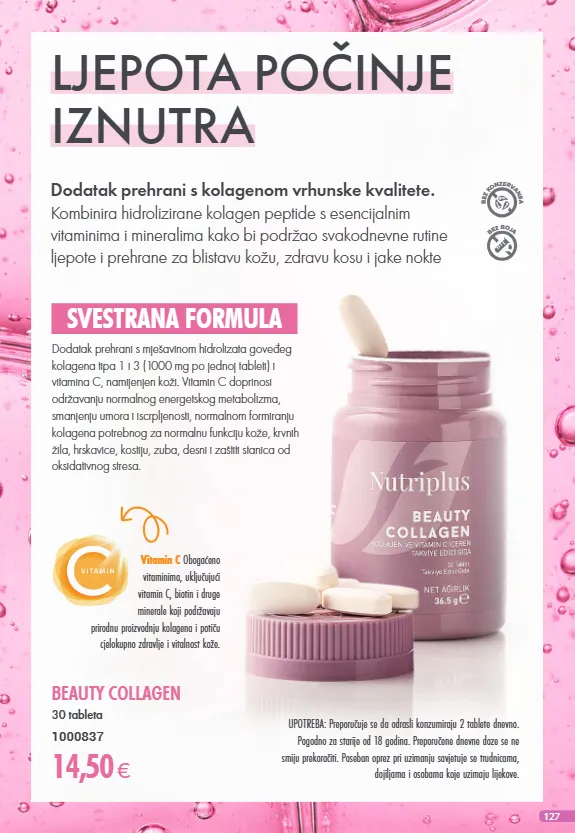 LJEPOTA POČINJE IZNUTRA Dodatak prehrani s kolagenom vrhunske kvalitete. Kombinira hidrolizirane kolagen peptide s esencijalnim vitaminima i mineralima kako bi podržao svakodnevne rutine ljepote i prehrane za blistavu kožu, zdravu kosu i jake nokte SVESTRANA FORMULA Dodatak prehrani s mješavinom hidrolizata goveđeg kolagena tipa 1 i 3 (1000 mg po jednoj tableti) i vitamina C, namijenjen koži. Vitamin C doprinosi održavanju normalnog energetskog metabolizma, smanjenju umora i iscrpljenosti, normalnom formiranju kolagena potrebnog za normalnu funkciju kože, krvnih žila, hrskavice, kostiju, zuba, desni i zaštiti stanica od oksidativnog stresa. BEAUTY COLLAGEN 30 tableta UPOTREBA: Preporučuje se da odrasli konzumiraju 2 tablete dnevno. Pogodno za starije od 18 godina. Preporučene dnevne doze se ne smiju prekoračiti. Poseban oprez pri uzimanju savjetuje se trudnicama, dojiljama i osobama koje uzimaju lijekove. 1000837 14,50 € B E Z K O N Z E R V A N S A B E Z B O J A Vitamin C Obogaćeno vitaminima, uključujući vitamin C, biotin i druge minerale koji podržavaju prirodnu proizvodnju kolagena i potiču cjelokupno zdravlje i vitalnost kože. 127 1000837