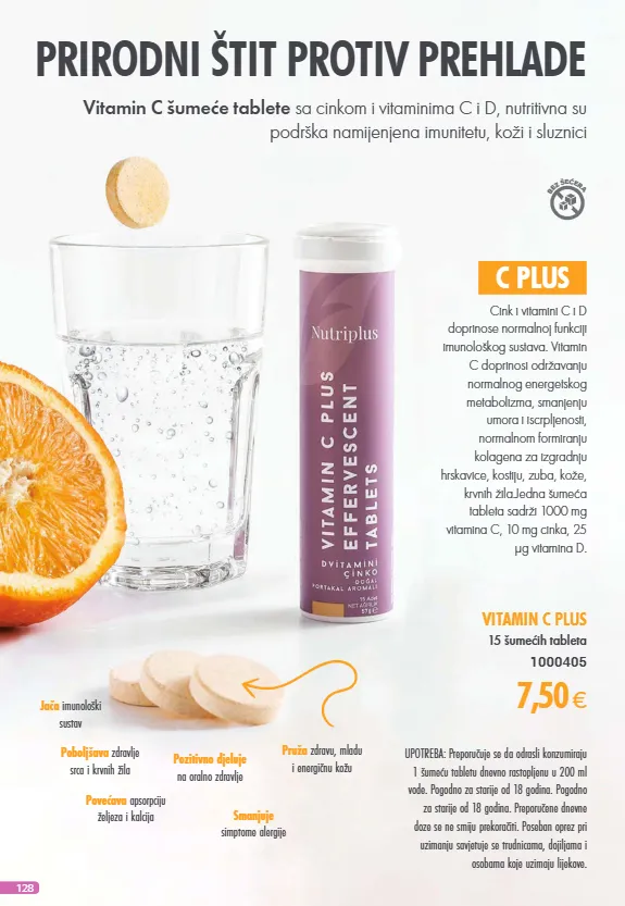 C PLUS Cink i vitamini C i D doprinose normalnoj funkciji imunološkog sustava. Vitamin C doprinosi održavanju normalnog energetskog metabolizma, smanjenju umora i iscrpljenosti, normalnom formiranju kolagena za izgradnju hrskavice, kostiju, zuba, kože, krvnih žila.Jedna šumeća tableta sadrži 1000 mg vitamina C, 10 mg cinka, 25 μg vitamina D. Vitamin C šumeće tablete sa cinkom i vitaminima C i D, nutritivna su podrška namijenjena imunitetu, koži i sluznici UPOTREBA: Preporučuje se da odrasli konzumiraju 1 šumeću tabletu dnevno rastopljenu u 200 ml vode. Pogodno za starije od 18 godina. Pogodno za starije od 18 godina. Preporučene dnevne doze se ne smiju prekoračiti. Poseban oprez pri uzimanju savjetuje se trudnicama, dojiljama i osobama koje uzimaju lijekove. 1000405 7,50 € VITAMIN C PLUS 15 šumećih tableta PRIRODNI ŠTIT PROTIV PREHLADE Jača imunološki sustav Poboljšava zdravlje srca i krvnih žila Povećava apsorpciju željeza i kalcija Pozitivno djeluje na oralno zdravlje Smanjuje simptome alergije Pruža zdravu, mladu i energičnu kožu B E Z Š E Ć E R A 128 1000405