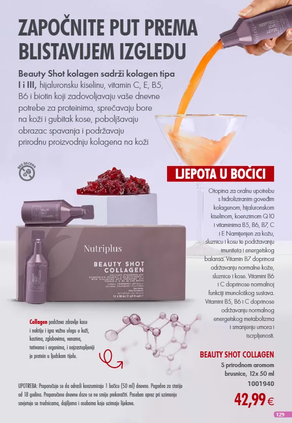 ZAPOČNITE PUT PREMA BLISTAVIJEM IZGLEDU 1001940 42,99 € Beauty Shot kolagen sadrži kolagen tipa I i III, hijaluronsku kiselinu, vitamin C, E, B5, B6 i biotin koji zadovoljavaju vaše dnevne potrebe za proteinima, sprečavaju bore na koži i gubitak kose, poboljšavaju obrazac spavanja i podržavaju prirodnu proizvodnju kolagena na koži LJEPOTA U BOČICI UPOTREBA: Preporučuje se da odrasli konzumiraju 1 bočicu (50 ml) dnevno. Pogodno za starije od 18 godina. Preporučene dnevne doze se ne smiju prekoračiti. Poseban oprez pri uzimanju savjetuje se trudnicama, dojiljama i osobama koje uzimaju lijekove. BEAUTY SHOT COLLAGEN S prirodnom aromom brusnice, 12x 50 ml Otopina za oralnu upotrebu s hidroliziranim goveđim kolagenom, hijaluronskom kiselinom, koenzimom Q10 i vitaminima B5, B6, B7, C i E Namijenjen za kožu, sluznicu i kosu te podržavanju imuniteta i energetskog balansa. Vitamin B7 doprinosi održavanju normalne kože, sluznice i kose. Vitamini B6 i C doprinose normalnoj funkciji imunološkog sustava. Vitamini B5, B6 i C doprinose održavanju normalnog energetskog metabolizma i smanjenju umora i iscrpljenosti. Collagen podržava zdravlje kose i noktiju i igra važnu ulogu u koži, kostima, zglobovima, venama, tetivama i organima, i najzastupljeniji je protein u ljudskom tijelu. B E Z Š E Ć E R A 129 1001940