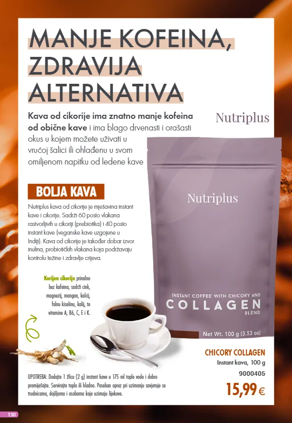9000405 15,99 € chicory collagen instant kava, 100 g manje kofeina, zdravija alternativa bolja kava nutriplus kava od cikorije je mješavina instant kave i cikorije. sadrži 60 posto vlakana rastvorljivih u cikoriji (prebiotika) i 40 posto instant kave (veganske kave uzgojene u indiji). kava od cikorije je također dobar izvor inulina, probiotičkih vlakana koja podržavaju kontrolu težine i zdravlje crijeva. upotreba: dodajte 1 žlicu (2 g) instant kave u 175 ml tople vode i dobro promiješajte. servirajte toplo ili hladno. poseban oprez pri uzimanju savjetuje se trudnicama, dojiljama i osobama koje uzimaju lijekove. kava od cikorije ima znatno manje kofeina od obične kave i ima blago drvenasti i orašasti okus u kojem možete uživati u vrućoj šalici ili ohlađenu u svom omiljenom napitku od ledene kave 130 korijen cikorije prirodno bez kafeina, sadrži cink, magnezij, mangan, kalcij, folnu kiselinu, kalij, te vitamine a, b6, c, e i k. 9000405