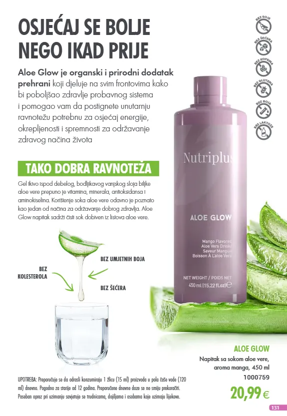 UPOTREBA: Preporučuje se da odrasli konzumiraju 1 žlicu (15 ml) proizvoda u pola čaše vode (120 ml) dnevno. Pogodno za starije od 12 godina. Preporučene dnevne doze se ne smiju prekoračiti. Poseban oprez pri uzimanju savjetuje se trudnicama, dojiljama i osobama koje uzimaju lijekove. OSJEĆAJ SE BOLJE NEGO IKAD PRIJE 1000759 20,99 € ALOE GLOW Napitak sa sokom aloe vere, aroma manga, 450 ml TAKO DOBRA RAVNOTEŽA Gel tkivo ispod debelog, bodljikavog vanjskog sloja biljke aloe vere prepuno je vitamina, minerala, antioksidansa i aminokiselina. Korištenje soka aloe vere odavno je poznato kao jedan od načina za održavanje dobrog zdravlja. Aloe Glow napitak sadrži čisti sok dobiven iz listova aloe vere. Aloe Glow je organski i prirodni dodatak prehrani koji djeluje na svim frontovima kako bi poboljšao zdravlje probavnog sistema i pomogao vam da postignete unutarnju ravnotežu potrebnu za osjećaj energije, okrepljenosti i spremnosti za održavanje zdravog načina života BEZ UMJETNIH BOJA BEZ KOLESTEROLA BEZ ŠEĆERA B E Z G L U T E N A B E Z S O J E B E Z Š E Ć E R A B E Z K O F E I N A B E Z B O J A B E Z L A K T O Z E 131 1000759