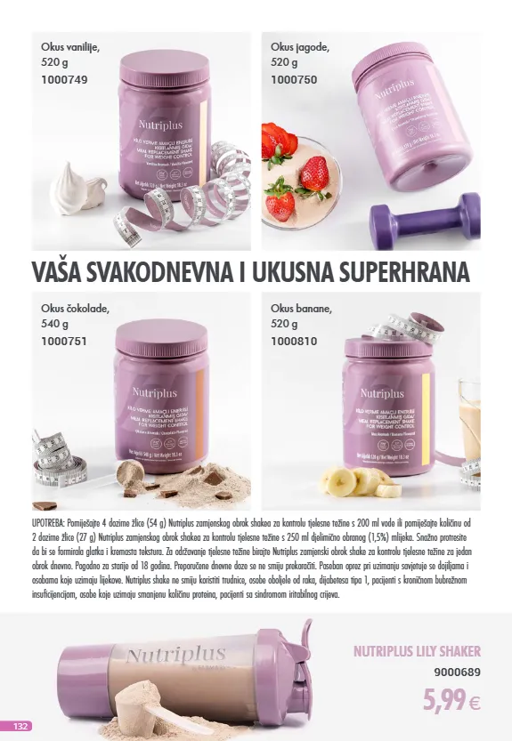 VAŠA SVAKODNEVNA I UKUSNA SUPERHRANA UPOTREBA: Pomiješajte 4 dozirne žlice (54 g) Nutriplus zamjenskog obrok shakea za kontrolu tjelesne težine s 200 ml vode ili pomiješajte količinu od 2 dozirne žlice (27 g) Nutriplus zamjenskog obrok shakea za kontrolu tjelesne težine s 250 ml djelimično obranog (1,5%) mlijeka. Snažno protresite da bi se formirala glatka i kremasta tekstura. Za održavanje tjelesne težine birajte Nutriplus zamjenski obrok shake za kontrolu tjelesne težine za jedan obrok dnevno. Pogodno za starije od 18 godina. Preporučene dnevne doze se ne smiju prekoračiti. Poseban oprez pri uzimanju savjetuje se dojiljama i osobama koje uzimaju lijekove. Nutriplus shake ne smiju koristiti trudnice, osobe oboljele od raka, dijabetesa tipa 1, pacijenti s kroničnom bubrežnom insuficijencijom, osobe koje uzimaju smanjenu količinu proteina, pacijenti sa sindromom iritabilnog crijeva. 132 Okus vanilije, 520 g Okus čokolade, 540 g Okus jagode, 520 g Okus banane, 520 g 1000749 1000751 1000750 1000810 9000689 5,99 € NUTRIPLUS LILY SHAKER 1000749 1000751 1000750 1000810 9000689