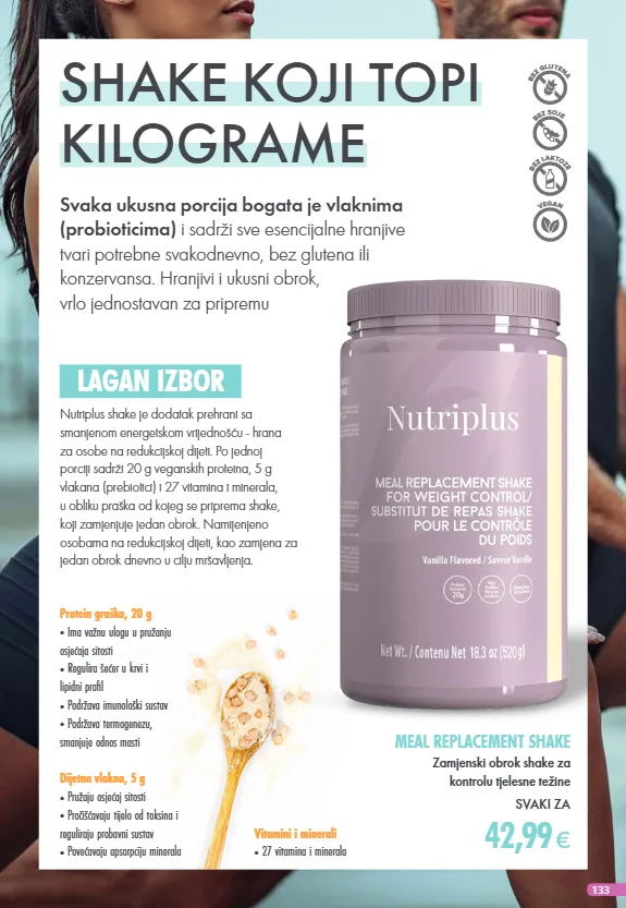 SHAKE KOJI TOPI KILOGRAME 133 42,99 € MEAL REPLACEMENT SHAKE Zamjenski obrok shake za kontrolu tjelesne težine SVAKI ZA LAGAN IZBOR Nutriplus shake je dodatak prehrani sa smanjenom energetskom vrijednošću - hrana za osobe na redukcijskoj dijeti. Po jednoj porciji sadrži 20 g veganskih proteina, 5 g vlakana (prebiotici) i 27 vitamina i minerala, u obliku praška od kojeg se priprema shake, koji zamjenjuje jedan obrok. Namijenjeno osobama na redukcijskoj dijeti, kao zamjena za jedan obrok dnevno u cilju mršavljenja. Svaka ukusna porcija bogata je vlaknima (probioticima) i sadrži sve esencijalne hranjive tvari potrebne svakodnevno, bez glutena ili konzervansa. Hranjivi i ukusni obrok, vrlo jednostavan za pripremu Protein graška, 20 g l Ima važnu ulogu u pružanju osjećaja sitosti l Regulira šećer u krvi i lipidni profil l Podržava imunološki sustav l Podržava termogenezu, smanjuje odnos masti Dijetna vlakna, 5 g l Pružaju osjećaj sitosti l Pročišćavaju tijelo od toksina i reguliraju probavni sustav l Povećavaju apsorpciju minerala Vitamini i minerali l 27 vitamina i minerala B E Z G L U T E N A B E Z S O J E B E Z L A K T O Z E V E G A N