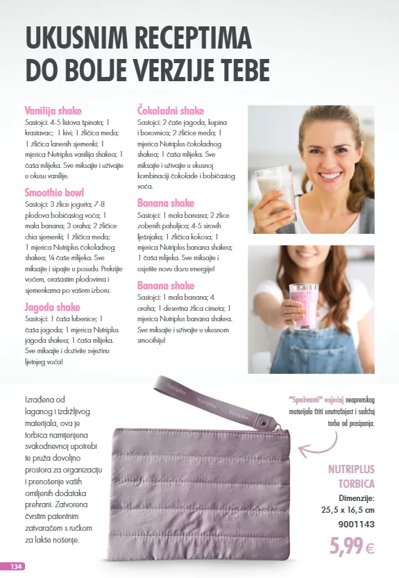 134 9001143 5,99 € nutriplus torbica dimenzije: 25,5 x 16,5 cm ukusnim receptima do bolje verzije tebe vanilija shake sastojci: 4-5 listova špinata; 1 krastavac; 1 kivi; 1 žličica meda; 1 žličica lanenih sjemenki; 1 mjerica nutriplus vanilija shakea; 1 čaša mlijeka. sve miksajte i uživajte u okusu vanilije. smoothie bowl sastojci: 3 žlice jogurta; 7-8 plodova bobičastog voća; 1 mala banana; 3 oraha; 2 žličice chia sjemenki; 1 žličica meda; 1 mjerica nutriplus čokoladnog shakea; ¼ čaše mlijeka. sve miksajte i sipajte u posudu. prekrijte voćem, orašastim plodovima i sjemenkama po vašem izboru. jagoda shake sastojci: 1 čaša lubenice; 1 čaša jagoda; 1 mjerica nutriplus jagoda shakea; 1 čaša mlijeka. sve miksajte i doživite svježinu ljetnjeg voća! čokoladni shake sastojci: 2 čaše jagoda, kupina i borovnica; 2 žličice meda; 1 mjerica nutriplus čokoladnog shakea; 1 čaša mlijeka. sve miksajte i uživajte u ukusnoj kombinaciji čokolade i bobičastog voća. banana shake sastojci: 1 mala banana; 2 žlice zobenih pahuljica; 4-5 sirovih lješnjaka; 1 žličica kokosa; 1 mjerica nutriplus banana shakea; 1 čaša mlijeka. sve miksajte i osjetite novu dozu energije! banana shake sastojci: 1 mala banana; 4 oraha; 1 desertna žlica cimeta; 1 mjerica nutriplus banana shakea. sve miksajte i uživajte u ukusnom smoothiju! izrađena od laganog i izdržljivog materijala, ova je torbica namijenjena svakodnevnoj upotrebi te pruža dovoljno prostora za organizaciju i prenošenje vaših omiljenih dodataka prehrani. zatvorena čvrstim patentnim zatvaračem s ručkom za lakše nošenje. "spužvasti" osjećaj neoprenskog materijala štiti unutrašnjost i sadržaj torbe od prosipanja. 9001143