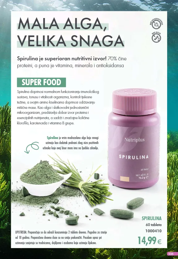 mala alga, velika snaga super food spirulina doprinosi normalnom funkcioniranju imunološkog sustava, tonusu i vitalnosti organizma, kontroli tjelesne težine, a svojim amino kiselinama doprinosi održavanju mišićne mase. kao alga i slatkovodni jednostanični mikroorganizam, predstavlja dobar izvor proteina i esencijalnih nutrijenata, a sadrži i značajne količine klorofila, karotenoida i vitamina b grupe. spirulina je superioran nutritivni izvor! 70% čine proteini, a puna je vitamina, minerala i antioksidansa 135 upotreba: preporučuje se da odrasli konzumiraju 2 tablete dnevno. pogodno za starije od 18 godina. preporučene dnevne doze se ne smiju prekoračiti. poseban oprez pri uzimanju savjetuje se trudnicama, dojiljama i osobama koje uzimaju lijekove. 1000410 14,99 € spirulina 60 tableta spirulina je vrsta modrozelene alge koju mnogi uzimaju kao dodatak prehrani zbog niza pozitivnih učinaka koje ovaj biser mora ima na ljudsko zdravlje. b e z k o n z e r v a n s a b e z b o j a 1000410