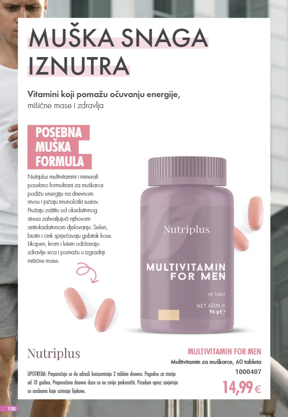muška snaga iznutra posebna muška formula nutriplus multivitamini i minerali posebno formulirani za muškarce podižu energiju na dnevnom nivou i jačaju imunološki sustav. pružaju zaštitu od oksidativnog stresa zahvaljujući njihovom antioksidativnom djelovanju. selen, biotin i cink sprječavaju gubitak kose. likopen, krom i lutein održavaju zdravlje srca i pomažu u izgradnji mišićne mase. vitamini koji pomažu očuvanju energije, mišićne mase i zdravlja upotreba: preporučuje se da odrasli konzumiraju 2 tablete dnevno. pogodno za starije od 18 godina. preporučene dnevne doze se ne smiju prekoračiti. poseban oprez savjetuje se osobama koje uzimaju lijekove. 1000407 14,99 € multivitamin for men multivitamin za muškarce, 60 tableta 138 1000407