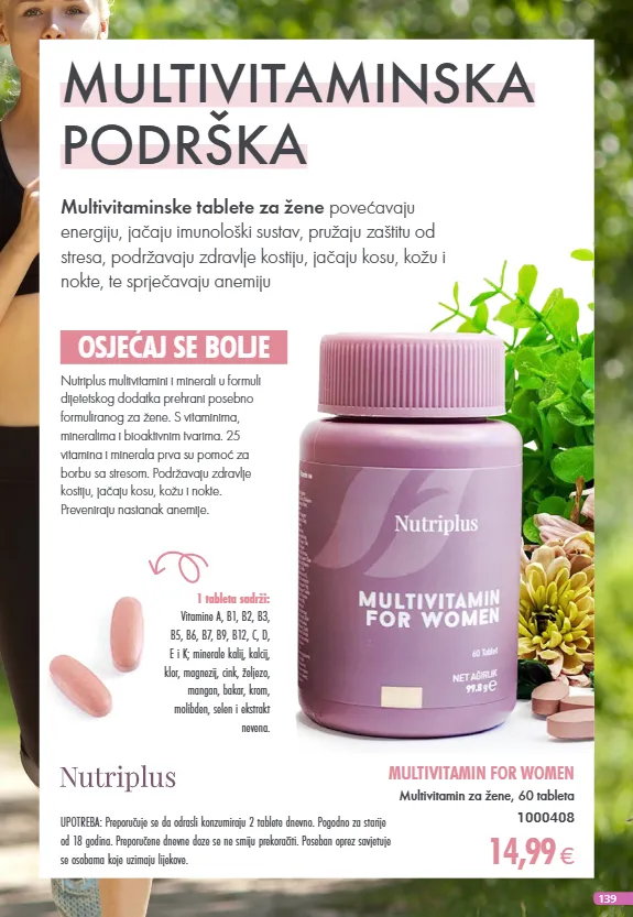 MULTIVITAMINSKA PODRŠKA OSJEĆAJ SE BOLJE Nutriplus multivitamini i minerali u formuli dijetetskog dodatka prehrani posebno formuliranog za žene. S vitaminima, mineralima i bioaktivnim tvarima. 25 vitamina i minerala prva su pomoć za borbu sa stresom. Podržavaju zdravlje kostiju, jačaju kosu, kožu i nokte. Preveniraju nastanak anemije. Multivitaminske tablete za žene povećavaju energiju, jačaju imunološki sustav, pružaju zaštitu od stresa, podržavaju zdravlje kostiju, jačaju kosu, kožu i nokte, te sprječavaju anemiju UPOTREBA: Preporučuje se da odrasli konzumiraju 2 tablete dnevno. Pogodno za starije od 18 godina. Preporučene dnevne doze se ne smiju prekoračiti. Poseban oprez savjetuje se osobama koje uzimaju lijekove. 1000408 14,99 € MULTIVITAMIN FOR WOMEN Multivitamin za žene, 60 tableta 139 1 tableta sadrži: Vitamine A, B1, B2, B3, B5, B6, B7, B9, B12, C, D, E i K; minerale kalij, kalcij, klor, magnezij, cink, željezo, mangan, bakar, krom, molibden, selen i ekstrakt nevena. 1000408