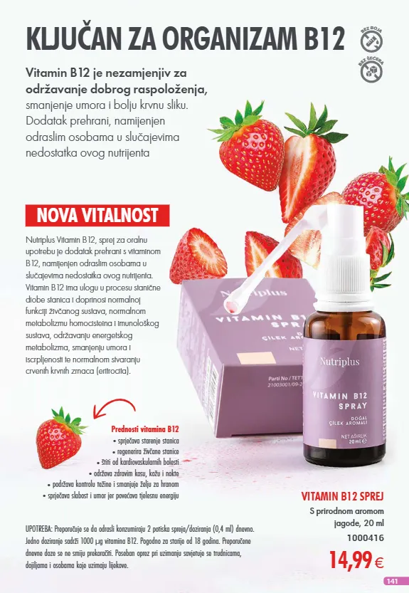 141 B E Z B O J A B E Z Š E Ć E R A UPOTREBA: Preporučuje se da odrasli konzumiraju 2 potiska spreja/doziranja (0,4 ml) dnevno. Jedno doziranje sadrži 1000 μg vitamina B12. Pogodno za starije od 18 godina. Preporučene dnevne doze se ne smiju prekoračiti. Poseban oprez pri uzimanju savjetuje se trudnicama, dojiljama i osobama koje uzimaju lijekove. KLJUČAN ZA ORGANIZAM B12 1000416 14,99 € VITAMIN B12 SPREJ S prirodnom aromom jagode, 20 ml Nutriplus Vitamin B12, sprej za oralnu upotrebu je dodatak prehrani s vitaminom B12, namijenjen odraslim osobama u slučajevima nedostatka ovog nutrijenta. Vitamin B12 ima ulogu u procesu stanične diobe stanica i doprinosi normalnoj funkciji živčanog sustava, normalnom metabolizmu homocisteina i imunološkog sustava, održavanju energetskog metabolizma, smanjenju umora i iscrpljenosti te normalnom stvaranju crvenih krvnih zrnaca (eritrocita). NOVA VITALNOST Vitamin B12 je nezamjenjiv za održavanje dobrog raspoloženja, smanjenje umora i bolju krvnu sliku. Dodatak prehrani, namijenjen odraslim osobama u slučajevima nedostatka ovog nutrijenta Prednosti vitamina B12 l sprječava starenje stanica l regenerira živčane stanice l štiti od kardiovaskularnih bolesti l održava zdravim kosu, kožu i nokte l podržava kontrolu težine i smanjuje želju za hranom l sprječava slabost i umor jer povećava tjelesnu energiju 1000416