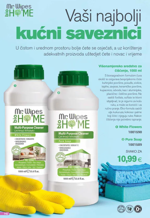 vaši najbolji kućni saveznici 142 2 pure soap 1 white flowers svako za 1001589 1001590 u čistom i urednom prostoru bolje ćete se osjećati, a uz korištenje adekvatnih proizvoda uštedjet ćete i novac i vrijeme višenamjensko sredstvo za čišćenje, 1000 ml s biorazgradivom formulom čuva okoliš te osigurava besprijekorno čiste kuhinjske površine, posuđe, stolice, tepihe, zavjese, keramičke površine, kupaonice, odvode, kao i aluminijske, plastične i čelične površine. ne sadrži fosfate, sulfate te klorni izbjeljivač, te je sigurno za kožu ruku, a može se koristiti i za ručno pranje. eko-formula sadrži ulje kukuruza, kokosa i palme koji štite i njeguju ruke. nakon čišćenja nije potrebno ispiranje. 10,99 € 1 2 1001589 1001590