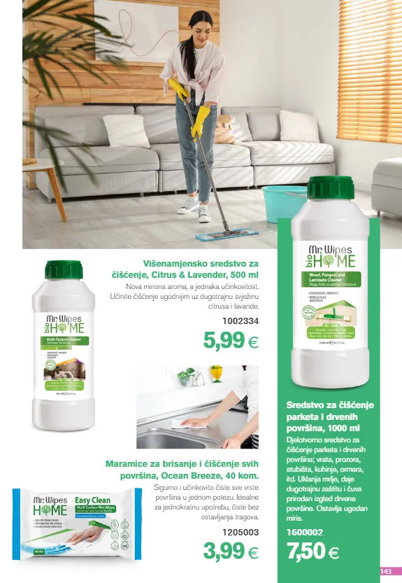 143 1600002 sredstvo za čišćenje parketa i drvenih površina, 1000 ml djelotvorno sredstvo za čišćenje parketa i drvenih površina; vrata, prozora, stubišta, kuhinje, ormara, itd. uklanja mrlje, daje dugotrajnu zaštitu i čuva prirodan izgled drvene površine. ostavlja ugodan miris. 7,50 € 1002334 1205003 višenamjensko sredstvo za čišćenje, citrus & lavender, 500 ml nova mirisna aroma, a jednaka učinkovitost. učinite čišćenje ugodnijim uz dugotrajnu svježinu citrusa i lavande. maramice za brisanje i čišćenje svih površina, ocean breeze, 40 kom. sigurno i učinkovito čiste sve vrste površina u jednom potezu. idealne za jednokratnu upotrebu, čiste bez ostavljanja tragova. 5,99 € 3,99 € 1600002 1002334 1205003