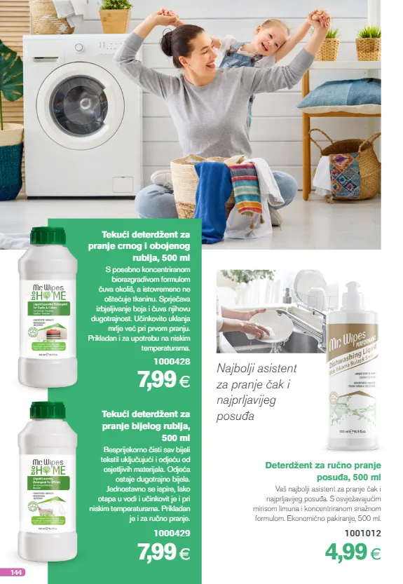 najbolji asistent za pranje čak i najprljavijeg posuđa 144 1001012 deterdžent za ručno pranje posuđa, 500 ml vaš najbolji asistent za pranje čak i najprljavijeg posuđa. s osvježavajućim mirisom limuna i koncentriranom snažnom formulom. ekonomično pakiranje, 500 ml. 4,99 € 1000428 1000429 tekući deterdžent za pranje crnog i obojenog rublja, 500 ml s posebno koncentriranom biorazgradivom formulom čuva okoliš, a istovremeno ne oštećuje tkaninu. sprječava izbjeljivanje boja i čuva njihovu dugotrajnost. učinkovito uklanja mrlje već pri prvom pranju. prikladan i za upotrebu na niskim temperaturama. tekući deterdžent za pranje bijelog rublja, 500 ml besprijekorno čisti sav bijeli tekstil uključujući i odjeću od osjetljivih materijala. odjeća ostaje dugotrajno bijela. jednostavno se ispire, lako otapa u vodi i učinkovit je i pri niskim temperaturama. prikladan je i za ručno pranje. 7,99 € 7,99 € 1001012 1000428 1000429