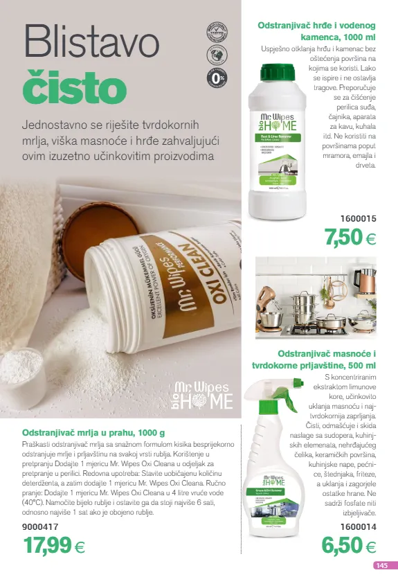 145 9000417 1600014 odstranjivač mrlja u prahu, 1000 g praškasti odstranjivač mrlja sa snažnom formulom kisika besprijekorno odstranjuje mrlje i prljavštinu na svakoj vrsti rublja. korištenje u pretpranju dodajte 1 mjericu mr. wipes oxi cleana u odjeljak za pretpranje u perilici. redovna upotreba: stavite uobičajenu količinu deterdženta, a zatim dodajte 1 mjericu mr. wipes oxi cleana. ručno pranje: dodajte 1 mjericu mr. wipes oxi cleana u 4 litre vruće vode (40°c). namočite bijelo rublje i ostavite ga da stoji najviše 6 sati, odnosno najviše 1 sat ako je obojeno rublje. odstranjivač hrđe i vodenog kamenca, 1000 ml uspješno otklanja hrđu i kamenac bez oštećenja površina na kojima se koristi. lako se ispire i ne ostavlja tragove. preporučuje se za čišćenje perilica suđa, čajnika, aparata za kavu, kuhala itd. ne koristiti na površinama poput mramora, emajla i drveta. odstranjivač masnoće i tvrdokorne prljavštine, 500 ml s koncentriranim ekstraktom limunove kore, učinkovito uklanja masnoću i naj- tvrdokornija zaprljanja. čisti, odmašćuje i skida naslage sa sudopera, kuhinj- skih elemenata, nehrđajućeg čelika, keramičkih površina, kuhinjske nape, pećni- ce, štednjaka, friteze, a uklanja i zagorjele ostatke hrane. ne sadrži fosfate niti izbjeljivače. 17,99 € 6,50 € blistavo čisto jednostavno se riješite tvrdokornih mrlja, viška masnoće i hrđe zahvaljujući ovim izuzetno učinkovitim proizvodima 1600015 7,50 € 9000417 1600014 1600015