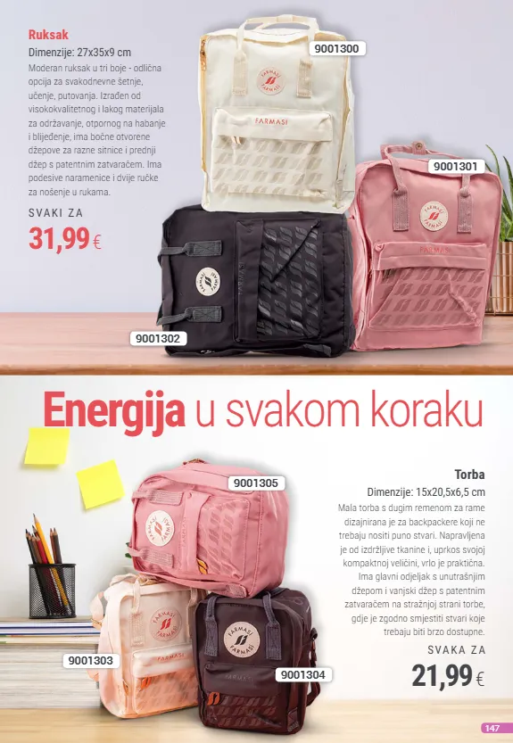 147 ruksak dimenzije: 27x35x9 cm moderan ruksak u tri boje - odlična opcija za svakodnevne šetnje, učenje, putovanja. izrađen od visokokvalitetnog i lakog materijala za održavanje, otpornog na habanje i blijeđenje, ima bočne otvorene džepove za razne sitnice i prednji džep s patentnim zatvaračem. ima podesive naramenice i dvije ručke za nošenje u rukama. torba dimenzije: 15x20,5x6,5 cm mala torba s dugim remenom za rame dizajnirana je za backpackere koji ne trebaju nositi puno stvari. napravljena je od izdržljive tkanine i, uprkos svojoj kompaktnoj veličini, vrlo je praktična. ima glavni odjeljak s unutrašnjim džepom i vanjski džep s patentnim zatvaračem na stražnjoj strani torbe, gdje je zgodno smjestiti stvari koje trebaju biti brzo dostupne. s v a k i z a s v a k a z a 31,99 € 21,99 € energija u svakom koraku 9001300 9001301 9001305 9001304 9001303 9001302 9001300 9001301 9001305 9001304 9001303 9001302