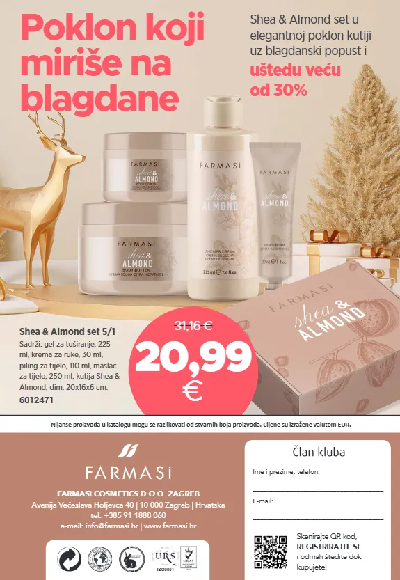 31,16 € 20,99 € iso9001 poklon koji miriše na blagdane shea & almond set 5/1 sadrži: gel za tuširanje, 225 ml, krema za ruke, 30 ml, piling za tijelo, 110 ml, maslac za tijelo, 250 ml, kutija shea & almond, dim: 20x16x6 cm. 6012471 shea & almond set u elegantnoj poklon kutiji uz blagdanski popust i uštedu veću od 30% farmasi cosmetics d.o.o. zagreb avenija većeslava holjevca 40 | 10 000 zagreb | hrvatska tel: +385 91 1888 060 e-mail: info@farmasi.hr | www.farmasi.hr ime i prezime, telefon: ____________________________________ e-mail: ____________________________________ skenirajte qr kod, registrirajte se i odmah štedite dok kupujete! nijanse proizvoda u katalogu mogu se razlikovati od stvarnih boja proizvoda. cijene su izražene valutom eur. 6012471