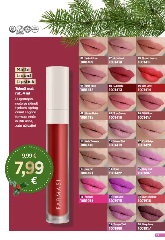 15 Matte Liquid Lipstick Tekući mat ruž, 4 ml Dugotrajan, neće se skinuti tijekom cijelog dana! Lagana formula neće isušiti usne, zato uživajte! 7,99 € 9,99 € Au Natural 02 1001410 Perfect Rose 01 1001409 Sunset Breeze 03 1001411 PARABEN FREE! Mauve Pink 11 1001419 Nude Essence 10 1001418 Superstar 05 1001413 Retro Rose 04 1001412 First Kiss 17 1001915 Passion 16 1001914 Brave 14 1001422 Cool Girl 13 1001421 Rose Dream 08 1001416 Money Maker 07 1001415 Tongue Tied 19 1001888 Cool Beige 12 1001420 Red Love 06 1001414 Burn Me Once 18 1001916 Baby Doll 15 1001887 Wild Rose 09 1001417 Deep Love 20 1001917 1001410 1001409 1001411 1001413 1001412 1001416 1001415 1001414 1001417 1001419 1001418 1001915 1001914 1001422 1001421 1001888 1001420 1001916 1001887 1001917