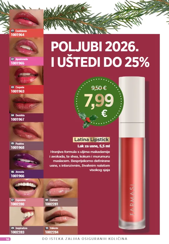 16 Confidente 01 1001964 Positiva 05 1001968 Coqueta 03 1001963 Expresiva 07 1002280 Curiosa 08 1002281 Apasionada 02 1001965 Atrevida 06 1001966 Decidida 04 1001967 Inspiradora 09 1002283 Valiente 10 1002284 7,99 € 9,50 € POLJUBI 2026. I UŠTEDI DO 25% Latina Lipstick Lak za usne, 5,5 ml Hranjiva formula s uljima makadamije i avokada, te shea, kokum i murumuru maslacem. Besprijekorno definirane usne, s intenzivnim, živahnim naletom visokog sjaja D O I S T E K A Z A L I H A O S I G U R A N I H K O L I Č I N A 1001964 1001968 1001963 1001965 1001967 1002280 1002281 1001966 1002283 1002284