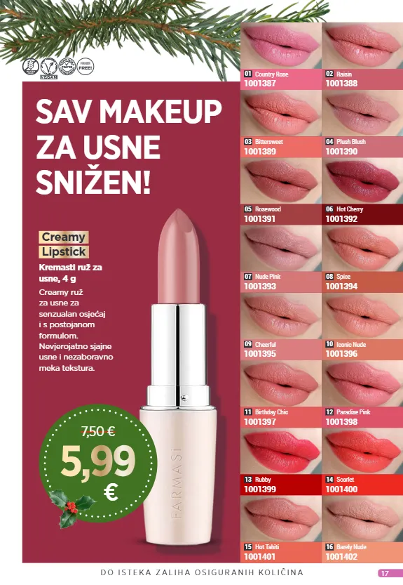 17 Creamy Lipstick Kremasti ruž za usne, 4 g Creamy ruž za usne za senzualan osjećaj i s postojanom formulom. Nevjerojatno sjajne usne i nezaboravno meka tekstura. Country Rose 01 1001387 Cheerful 09 1001395 Rosewood 05 1001391 Rubby 13 1001399 Bittersweet 03 1001389 Birthday Chic 11 1001397 Nude Pink 07 1001393 Hot Tahiti 15 1001401 Raisin 02 1001388 Iconic Nude 10 1001396 Hot Cherry 06 1001392 Scarlet 14 1001400 Plush Blush 04 1001390 Paradise Pink 12 1001398 Spice 08 1001394 Barely Nude 16 1001402 5,99 € 7,50 € SAV MAKEUP ZA USNE SNIŽEN! D O I S T E K A Z A L I H A O S I G U R A N I H K O L I Č I N A PARABEN FREE! 1001387 1001391 1001389 1001393 1001388 1001392 1001390 1001394 1001395 1001399 1001397 1001401 1001396 1001400 1001398 1001402