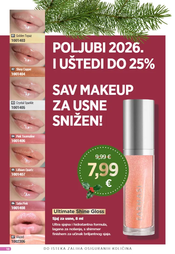 18 POLJUBI 2026. I UŠTEDI DO 25% Crystal Sparkle 03 1001405 Lithium Quartz 05 1001407 Glazed 07 1002306 Shiny Copper 02 1001404 Pink Tourmaline 04 1001406 Satin Pink 06 1001408 Ultimate Shine Gloss Sjaj za usne, 8 ml Ultra sjajna i hidratantna formula, lagana za nošenje, s shimmer finishem za učinak briljantnog sjaja. 7,99 € 9,99 € Golden Topaz 01 1001403 SAV MAKEUP ZA USNE SNIŽEN! D O I S T E K A Z A L I H A O S I G U R A N I H K O L I Č I N A 1001405 1001404 1001406 1001403 1001407 1002306 1001408