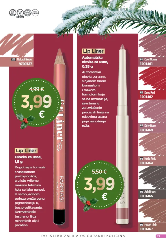 21 Lip Liner Automatska olovka za usne, 0,35 g Automatska olovka za usne, s njenom finom kremastom i mekom formulom koja se ne razmazuje, savršena je za izvlačenje preciznih linija na rubovima usana prije nanošenja ruža. Cool Mauve 01 1001461 Natural Beige 203 9700737 Dirty Rose 03 1001463 Ash Brown 05 1001465 Deep Red 02 1001462 Nude Pink 04 1001464 Peach Pink 06 1001467 Lip Liner Olovka za usne, 1,5 g Dugotrajna formula s višesatnom postojanošću, a u isto vrijeme mekana tekstura koja se lako nanosi. U samo jednom potezu pruža punu pigmentaciju u, bez preslikavanja. Dermatološki testirano. Bez mineralnih ulja i parafina. 3,99 € 4,99 € 3,99 € 5,50 € D O I S T E K A Z A L I H A O S I G U R A N I H K O L I Č I N A PARABEN FREE! 9700737 1001461 1001463 1001465 1001462 1001464 1001467