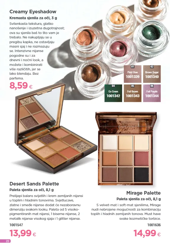 1001342 Go Green 04 1001344 Foil Purple 06 1001343 Foil Brown 05 1001547 Desert Sands Palette Paleta sjenila za oči, 8,1 g Prelijepi balans svijetlih i krem zemljanih nijansi u toplim i hladnim tonovima. Svjetlucave, zlatne i smeđe nijanse dodat će nezaboravnu dimenziju svakom looku. Paleta od 5 visoko- pigmentiranih mat nijansi, 1 biserne nijanse, 2 metalik nijanse visokog sjaja i 1 glitter nijanse. 13,99 € 22 Creamy Eyeshadow Kremasta sjenila za oči, 3 g Svilenkasta tekstura, glatko nanošenje i izuzetna dugotrajnost; ova su sjenila baš to što vam je trebalo. Ne nakupljaju se u pregibu kapka, ne ostavljaju masni sjaj i ne razmazuju se. Intenzivne nijanse pogodne su i za dnevni i noćni look, a možete i kombinirati više različitih, jer se lako blendaju. Bez parfema. 8,59 € 1001636 Mirage Palette Paleta sjenila za oči, 8,1 g S velvet-mat i soft-mat sjenilima, Mirage nudi nebrojene mogućnosti za kombinaciju toplih i hladnih zemljanih tonova. Must have svake kozmetičke torbice. 14,99 € 1001339 Pink Glow 01 1001340 Brown Sugar 02 1001342 1001344 1001343 1001339 1001340 1001547 1001636