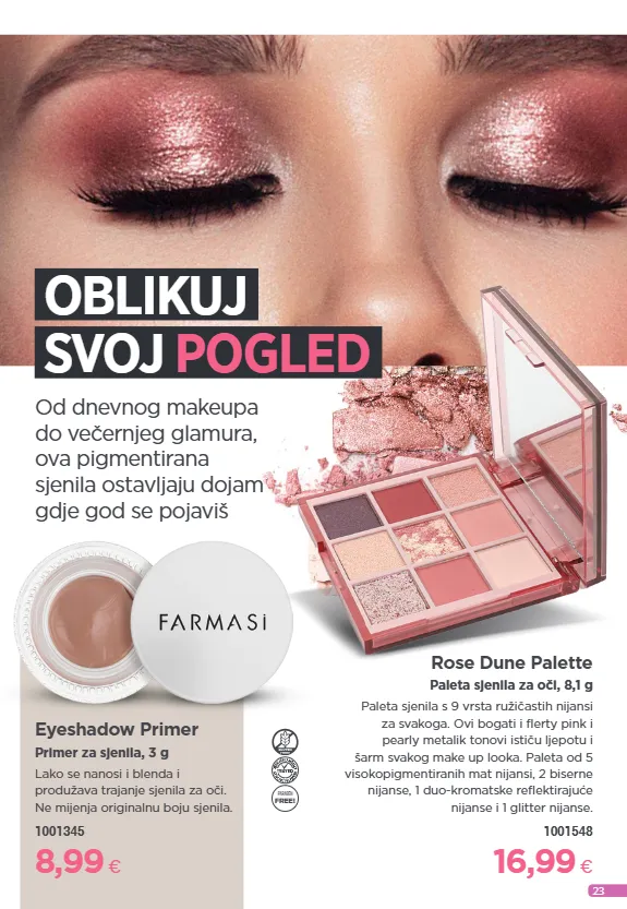 1001548 16,99 € OBLIKUJ SVOJ POGLED 23 Od dnevnog makeupa do večernjeg glamura, ova pigmentirana sjenila ostavljaju dojam gdje god se pojaviš Rose Dune Palette Paleta sjenila za oči, 8,1 g Paleta sjenila s 9 vrsta ružičastih nijansi za svakoga. Ovi bogati i flerty pink i pearly metalik tonovi ističu ljepotu i šarm svakog make up looka. Paleta od 5 visokopigmentiranih mat nijansi, 2 biserne nijanse, 1 duo-kromatske reflektirajuće nijanse i 1 glitter nijanse. 8,99 € Eyeshadow Primer Primer za sjenila, 3 g Lako se nanosi i blenda i produžava trajanje sjenila za oči. Ne mijenja originalnu boju sjenila. 1001345 PARABEN FREE! 1001548 1001345