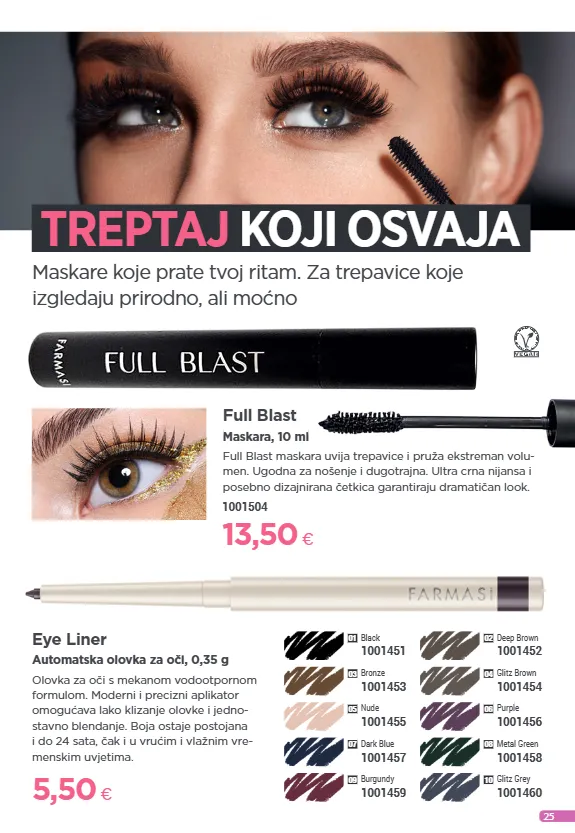25 eye liner automatska olovka za oči, 0,35 g olovka za oči s mekanom vodootpornom formulom. moderni i precizni aplikator omogućava lako klizanje olovke i jedno- stavno blendanje. boja ostaje postojana i do 24 sata, čak i u vrućim i vlažnim vre- menskim uvjetima. 5,50 € treptaj koji osvaja 01 black 1001451 03 bronze 1001453 05 nude 1001455 07 dark blue 1001457 09 burgundy 1001459 02 deep brown 1001452 04 glitz brown 1001454 06 purple 1001456 08 metal green 1001458 10 glitz grey 1001460 maskare koje prate tvoj ritam. za trepavice koje izgledaju prirodno, ali moćno 1001504 full blast maskara, 10 ml full blast maskara uvija trepavice i pruža ekstreman volu- men. ugodna za nošenje i dugotrajna. ultra crna nijansa i posebno dizajnirana četkica garantiraju dramatičan look. 13,50 € 1001451 1001453 1001455 1001452 1001454 1001456 1001504 1001457 1001459 1001458 1001460