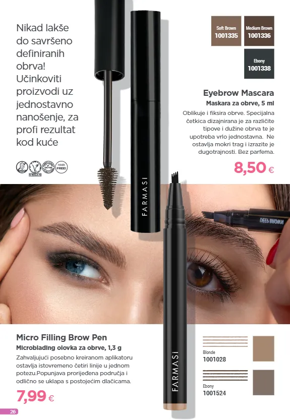 26 eyebrow mascara maskara za obrve, 5 ml oblikuje i fiksira obrve. specijalna četkica dizajnirana je za različite tipove i dužine obrva te je upotreba vrlo jednostavna. ne ostavlja mokri trag i izrazite je dugotrajnosti. bez parfema. 8,50 € nikad lakše do savršeno definiranih obrva! učinkoviti proizvodi uz jednostavno nanošenje, za profi rezultat kod kuće paraben free! micro filling brow pen microblading olovka za obrve, 1,3 g zahvaljujući posebno kreiranom aplikatoru ostavlja istovremeno četiri linije u jednom potezu.popunjava prorijeđena područja i odlično se uklapa s postojećim dlačicama. 7,99 € 1001336 medium brown 1001338 ebony 1001335 soft brown 1001028 blonde 1001524 ebony 1001336 1001338 1001335 1001028 1001524
