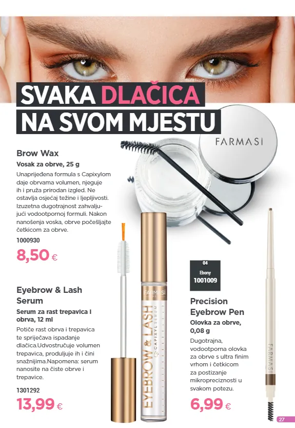 27 Brow Wax Vosak za obrve, 25 g Unaprijeđena formula s Capixylom daje obrvama volumen, njeguje ih i pruža prirodan izgled. Ne ostavlja osjećaj težine i ljepljivosti. Izuzetna dugotrajnost zahvalju- jući vodootpornoj formuli. Nakon nanošenja voska, obrve počešljajte četkicom za obrve. Eyebrow & Lash Serum Serum za rast trepavica i obrva, 12 ml Potiče rast obrva i trepavica te spriječava ispadanje dlačica.Udvostručuje volumen trepavica, produljuje ih i čini snažnijima.Napomena: serum nanosite na čiste obrve i trepavice. 13,99 € SVAKA DLAČICA NA SVOM MJESTU 1301292 1000930 Precision Eyebrow Pen Olovka za obrve, 0,08 g Dugotrajna, vodootporna olovka za obrve s ultra finim vrhom i četkicom za postizanje mikropreciznosti u svakom potezu. 6,99 € 8,50 € 1001009 Ebony 04 1301292 1000930 1001009