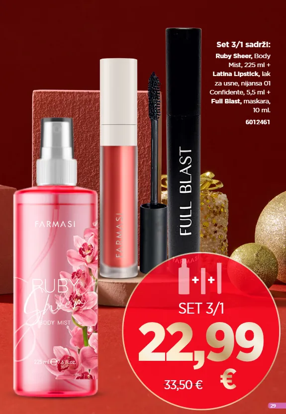 29 6012461 set 3/1 sadrži: ruby sheer, body mist, 225 ml + latina lipstick, lak za usne, nijansa 01 confidente, 5,5 ml + full blast, maskara, 10 ml. 22,99 € 33,50 € set 3/1 + + 6012461