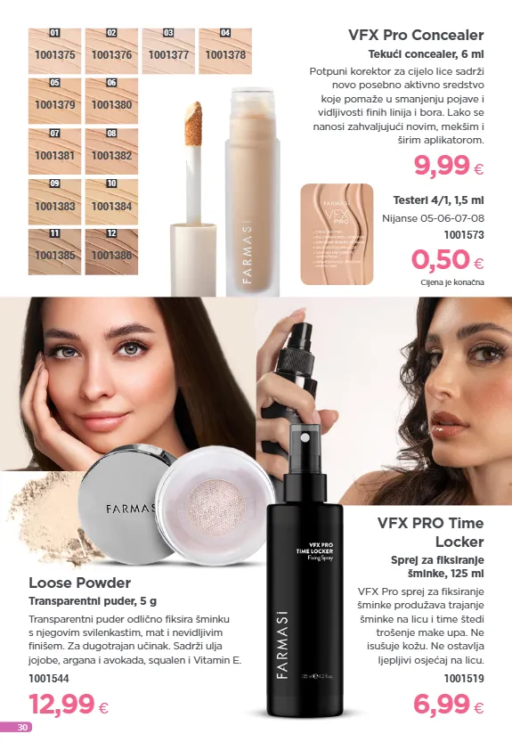 30 VFX Pro Concealer Tekući concealer, 6 ml Potpuni korektor za cijelo lice sadrži novo posebno aktivno sredstvo koje pomaže u smanjenju pojave i vidljivosti finih linija i bora. Lako se nanosi zahvaljujući novim, mekšim i širim aplikatorom. 1001375 01 1001379 05 1001383 09 1001377 03 1001381 07 1001385 11 1001376 02 1001380 06 1001384 10 1001378 04 1001382 08 1001386 12 9,99 € 0,50 € 1001573 Cijena je konačna Testeri 4/1, 1,5 ml Nijanse 05-06-07-08 1001519 VFX PRO Time Locker Sprej za fiksiranje šminke, 125 ml VFX Pro sprej za fiksiranje šminke produžava trajanje šminke na licu i time štedi trošenje make upa. Ne isušuje kožu. Ne ostavlja ljepljivi osjećaj na licu. 6,99 € Loose Powder Transparentni puder, 5 g Transparentni puder odlično fiksira šminku s njegovim svilenkastim, mat i nevidljivim finišem. Za dugotrajan učinak. Sadrži ulja jojobe, argana i avokada, squalen i Vitamin E. 12,99 € 1001544 1001375 1001379 1001383 1001377 1001381 1001385 1001376 1001380 1001384 1001378 1001382 1001386 1001573 1001519 1001544