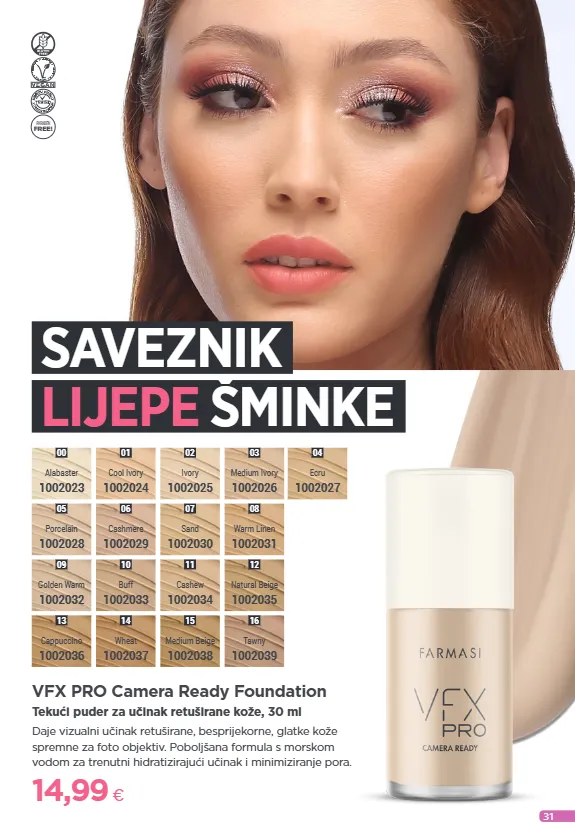 31 vfx pro camera ready foundation tekući puder za učinak retuširane kože, 30 ml daje vizualni učinak retuširane, besprijekorne, glatke kože spremne za foto objektiv. poboljšana formula s morskom vodom za trenutni hidratizirajući učinak i minimiziranje pora. 14,99 € saveznik lijepe šminke 1002023 00 alabaster 1002028 05 porcelain 1002032 09 golden warm 1002036 13 cappuccino 1002025 02 ivory 1002030 07 sand 1002034 11 cashew 1002038 15 medium beige 1002024 01 cool ivory 1002029 06 cashmere 1002033 10 buff 1002037 14 wheat 1002026 03 medium ivory 1002031 08 warm linen 1002035 12 natural beige 1002039 16 tawny 1002027 04 ecru paraben free! 1002023 1002028 1002025 1002030 1002024 1002029 1002026 1002031 1002027 1002032 1002036 1002034 1002038 1002033 1002037 1002035 1002039