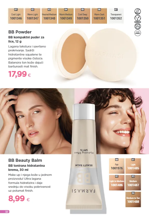 32 BB Beauty Balm BB tonirana hidratantna krema, 30 ml Make up i njega kože u jednom proizvodu! Ultra lagana formula hidratizira i daje srednju do visoku pokrivenost uz polumat finish. 8,99 € 1001351 Warm Dark 06 1001350 Cool Deep 05 1001348 Neutral Medium 03 1001352 Transparent 07 1001349 Warm Medium 04 1001347 Warm Light 02 1001346 Cool Light 01 PARABEN FREE! 1001976 Fair 00 1001486 Light to Medium 02 1001485 Light 01 1001487 Medium 03 1001488 Medium to Tan 04 BB Powder BB kompaktni puder za lice, 12 g Lagana tekstura i savršeno prekrivanje. Sadrži hidratantne squalene te pigmente visoke čistoće. Balansira ton kože dajući baršunasti mat finish. 17,99 € 1001351 1001350 1001348 1001352 1001349 1001347 1001346 1001976 1001486 1001485 1001487 1001488